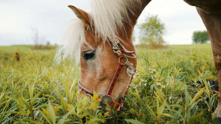 A flaxen horse grazing in the beautiful field meadows. A light brown horse with a blonde mane eating grass on the horse farm. Lush greenery in the background. Scene from the horse farm.
