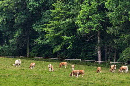 Brown cows graze on green meadow near forest on summer day, close-up. High quality photo