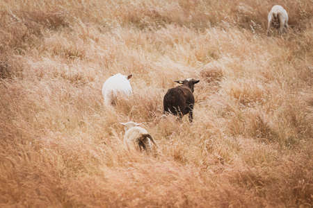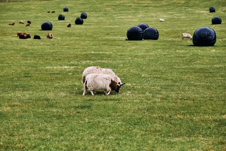 Sheep at the meadow, as symbol of 2015 year, photo was made in vintage toned style