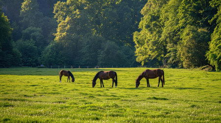 Horses grazing in a lush green meadow surrounded by trees, showcasing the beauty of nature in a serene atmosphere The scene features three horses peacefully feeding on grass