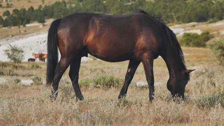 Dark horse grazing in the dry steppe of Crimea near Belogorsk