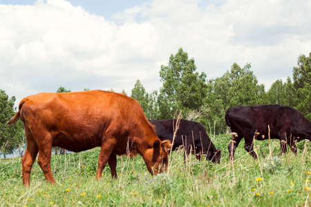 Cows graze green grass. The concept of agriculture, the cultivation of livestock. Colorful cows. steers, young calves graze on the summer juicy grass. Warm light. production of milk, beef, cheese.