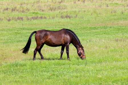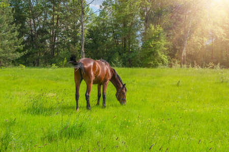 A horse grazing in the beautiful field meadows. A dark bay horse with a black mane eating grass on the horse farm. Lush greenery in the background. Scene from the horse farm.