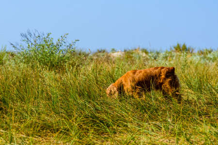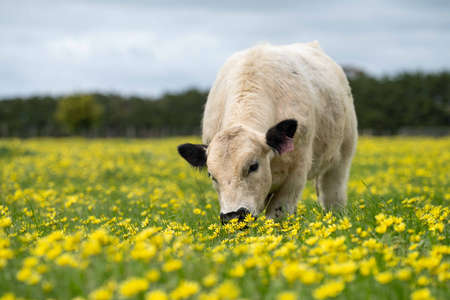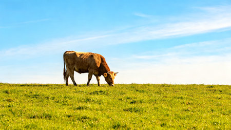 Cow grazing and chewing on the grass on a sunny day, farm animals