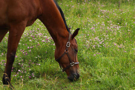 Beautiful chestnut horse grazing in summer field. Green pasture with feeding farm stallion.