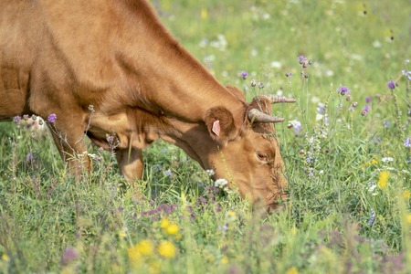 Red cow eating grass at the foot of the mountain on a green meadow with flowers