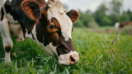 A beautiful brown and white cow peacefully grazes on vibrant green grass in a sunlit meadow. The tranquil scene captures the essence of rural life, showcasing the cows gentle demeanor amidst a backdrop of soft sunlight filtering through trees.