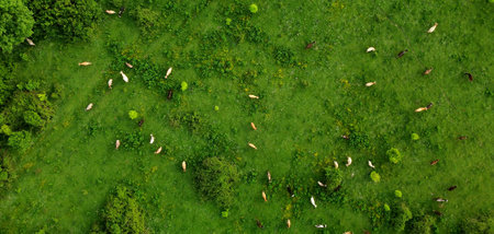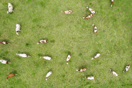 A herd in a green meadow, top view. Juicy green grass on a pasture, a farmer's field. agricultural landscape. animal husbandry.