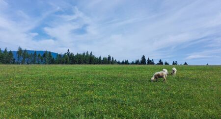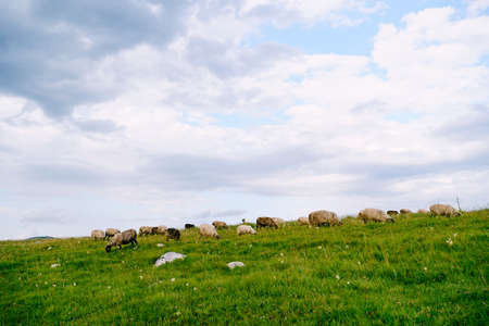 A flock of sheep grazes on a hill and eats green grass, against a blue sky with white clouds.