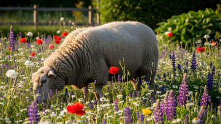 A fluffy white sheep grazes peacefully in a vibrant meadow filled with colorful lupines, poppies, and daisies. The warm sunlight illuminates the animal's wool and the surrounding flowers, creating a picturesque rural scene.