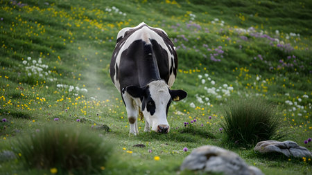 A black and white cow grazes peacefully in a lush green meadow filled with wildflowers. The rolling hills and soft lighting create a classic and scenic pastoral landscape.
