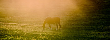 Horses graze peacefully in a lush green pasture, bathed in warm golden light, with a soft focus background showing the tranquility of rural life.