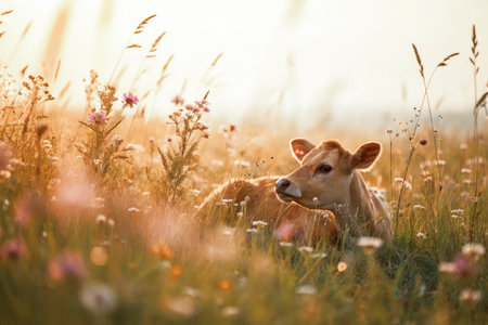A young calf is peacefully resting in tall grass surrounded by colorful wildflowers. The sunlight creates a warm atmosphere, highlighting the beauty of nature and tranquility.