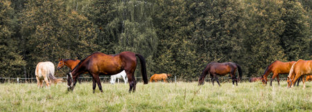 Beautiful natural landscape. Beautiful horses in the pasture. The horses are in the paddock. Livestock.