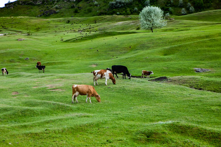 Cows grazing on a meadow in the mountains. Rural landscape.