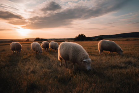 Sheep grazing peacefully in a sunlit field, enjoying the warm glow of the setting sun and creating a serene countryside atmosphere