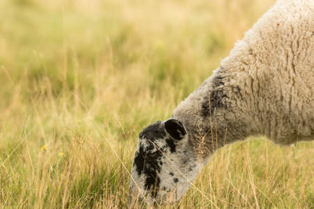 Close-up of a freerange sheep with head down grazing in long grass. Organic free range farming with profile image of a ewe with side view of head and neck feeding on wild pasture UK.