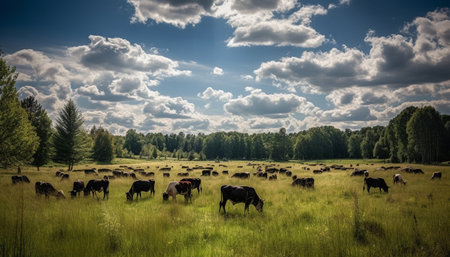 Idyllic dairy farm landscape with grazing cattle under sunset sky generated by artificial intelligence