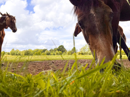 Rural landscape with grazing horses. Brown and white horse in the pasture. Beautiful horses on a farm after the havy rain. Horses eat green grass in the meadow after the rain. Horses in the meadow after the rain.