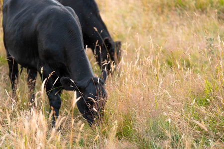 sustainable regenerative agriculture farm in australia, Herd of Cattle in Golden Australian Pasture, Black Angus Cows Grazing in Australian summer