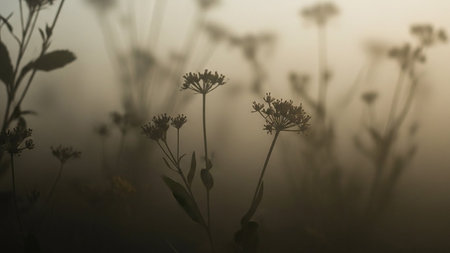 Delicate wildflowers and plants are silhouetted against a soft, foggy background in muted earthy tones