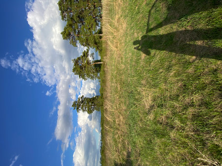 Step into a vibrant green field beneath a vast blue sky with fluffy clouds casting playful shadowsan ideal scene for nature lovers seeking joy and relaxation away from daily life