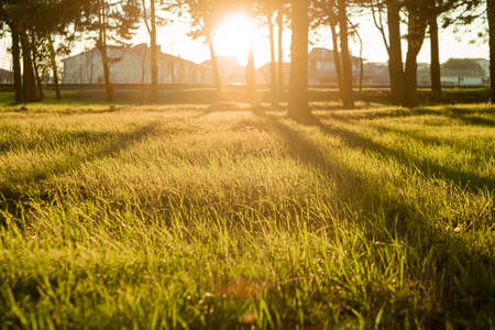 Sunset or sunrise in the forest with green grass and trees.