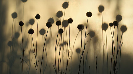 Close-up view of tall plants, creating a beautiful silhouette against a soft, diffused light source. The image showcases the delicate stems and seed heads of the plants, with variations in shadow and light, emphasizing the textures and forms. The overall color palette is muted and sepia-toned.