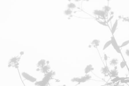 Summer background from the shadow of a sprig of field grass on a white wall. White and black for photo or mockup