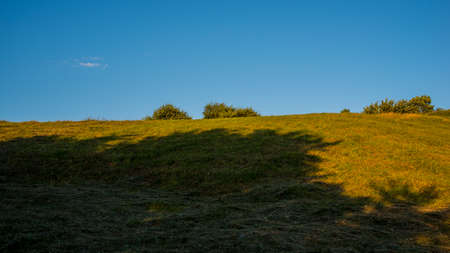 Trees hill top huge shadow against blue sky in the evening, rural landscape. Summer season. Web banner. Natural background for design. Ukraine. Europe.