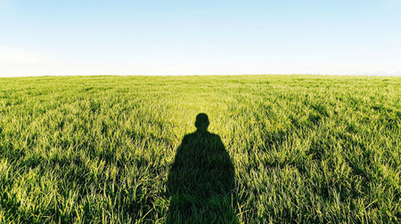 Silhouette of a man standing on a green meadow with blue sky