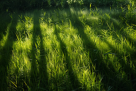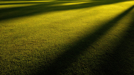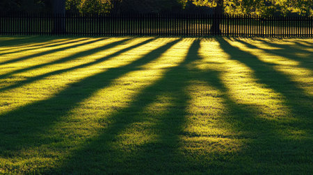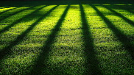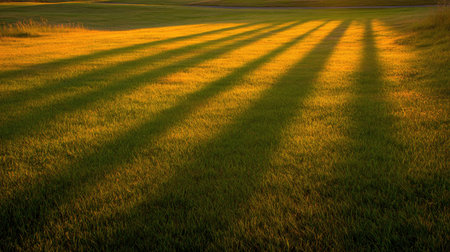 A vivid image of green grass illuminated by warm sunlight, creating long shadows that form an artistic and serene pattern on the ground.