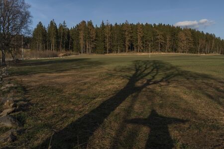 Meadow and forest in sunset evening with long shadows and blue sky