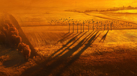 Wind turbines at sunset casting long shadows across golden fields, while a formation of geese flies by