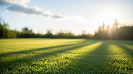 Discover a vibrant scene of lush green grass illuminated by sunlight, casting long shadows, perfect for promoting tranquility and outdoor relaxation activities.