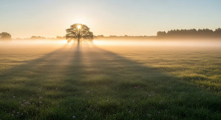 A solitary tree stands as a silhouette against a misty sunrise. Golden sunbeams pierce through the dense fog, creating dramatic rays of light that stretch across a dew-kissed meadow. The warm, ethereal glow of the rising sun illuminates the mist, lending an atmospheric and tranquil to the scene. The vast, open field and the distant treeline create a sense of peace and quietude, capturing the serene beauty of a new day awakening.