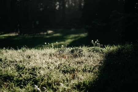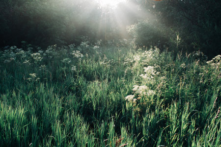 Early morning sunlight. Grass illuminated by rays of light