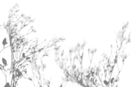 Overlay effect for photo. Blurred gray shadows of dandelion flowers and delicate grass on a white wall. Abstract neutral nature concept background. Space for text. Shadow for natural light effects.