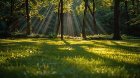 Sun rays filter through trees, illuminating grass on the groundcover
