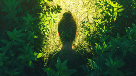 Silhouette of young attractive woman standing while the shadow merging in grass or nature. Beautiful energetic female shadow standing against calm green environment at garden or forest. AIG42.