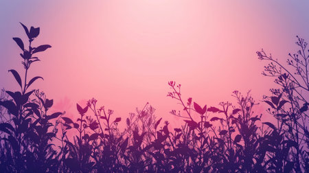 A row of tree silhouettes with twisted twigs against a pink and violet dusk sky, creating a serene natural landscape atmosphere AIG50