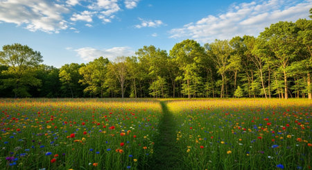 A picturesque meadow with vibrant wildflowers basking in the warm glow of the sun. The scene captures a peaceful moment in nature, showcasing lush green grass and colorful blossoms.