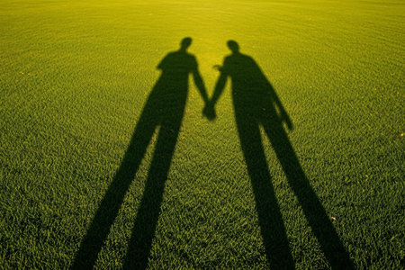 Two people standing in a field with shadows