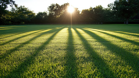 A beautiful sunrise casts long shadows across a vibrant green lawn, creating a peaceful and serene atmosphere. Perfect for nature enthusiasts and outdoor settings.