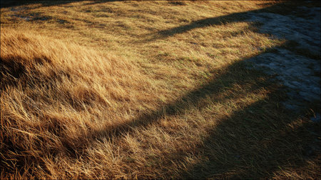 20251228 showing close-up of a lush green grass field with a long shadow cast by sunlight during golden hour...