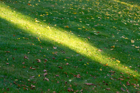 Tree trunk shadow fallen on the grass with autumn orange leaves. Beautiful diagonal autumnal background. Marlay Park, Dublin, Ireland