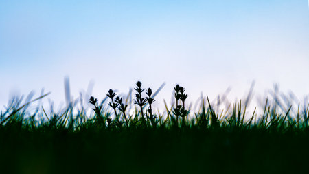 Green grass with sunset views. Blurred natural background