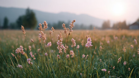 A captivating scene of a tranquil meadow at dusk, featuring delicate pink wildflowers gently swaying in the breeze, framed by soft mountains and warm sunlight.