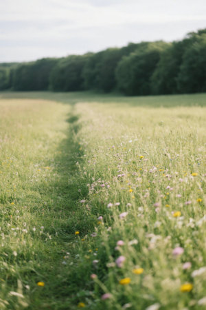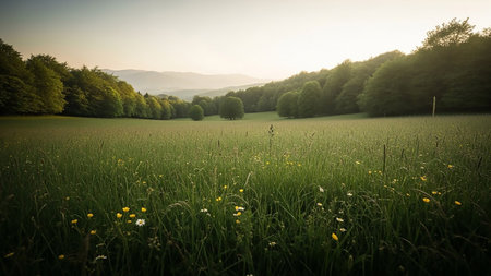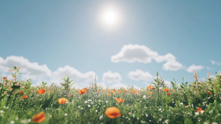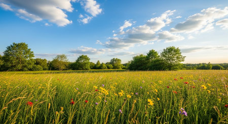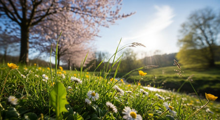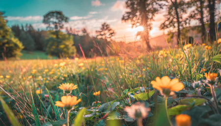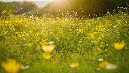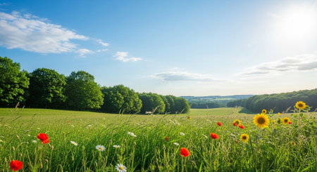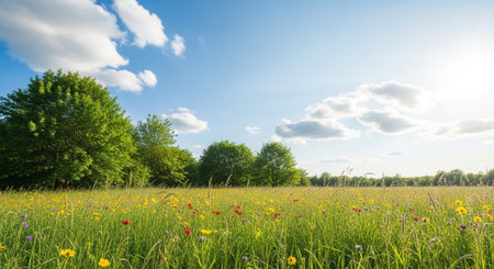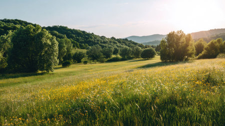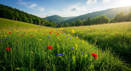 Scenic meadow with wildflowers and bright sunlight, nature landscape