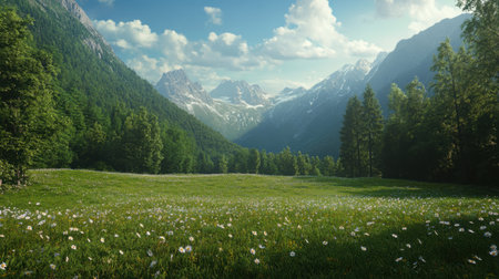 A stunning view of a vast meadow blanketed with flowers, surrounded by majestic mountains and lush forests under a bright blue sky, ideal for nature lovers.